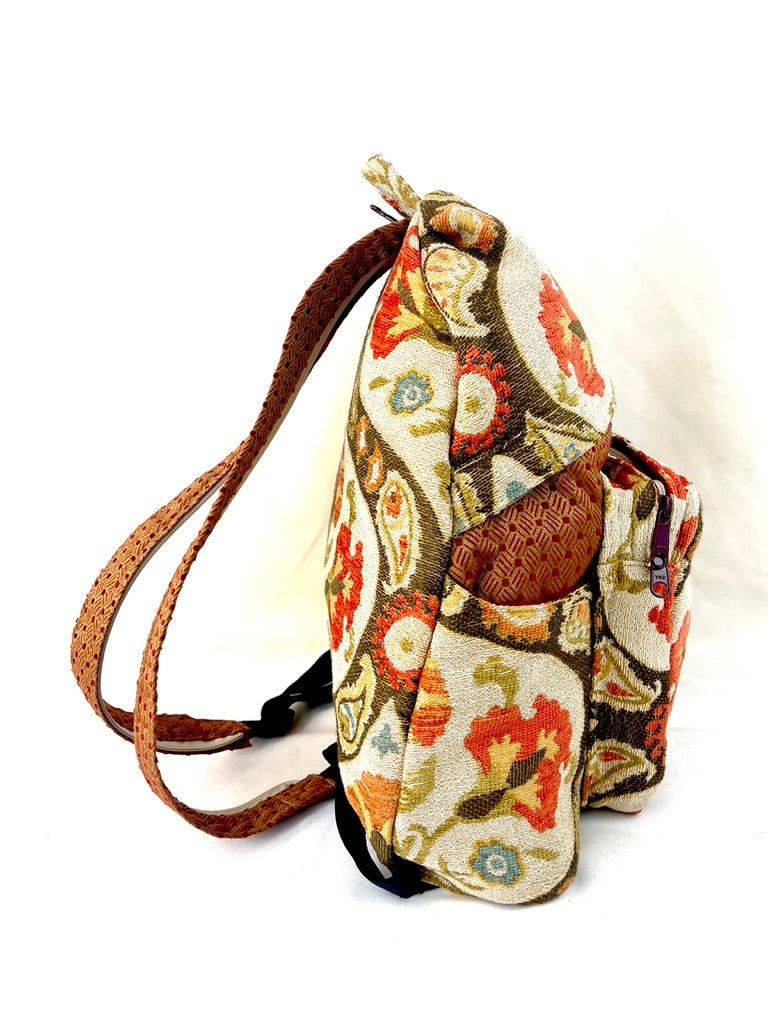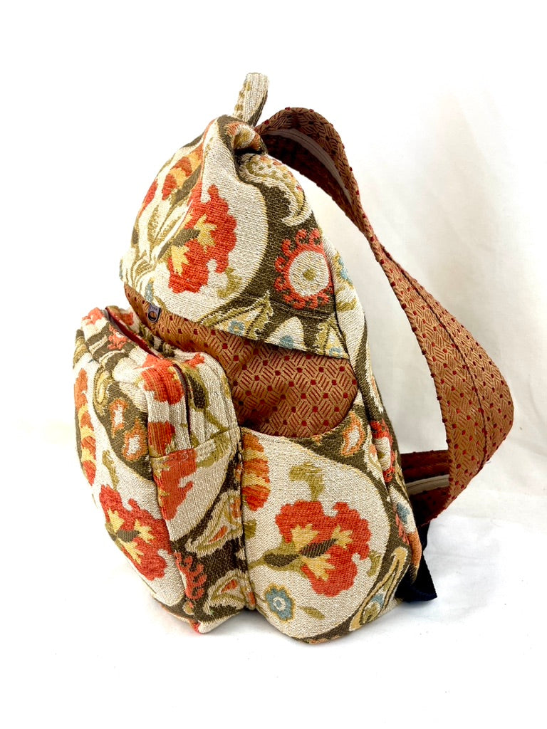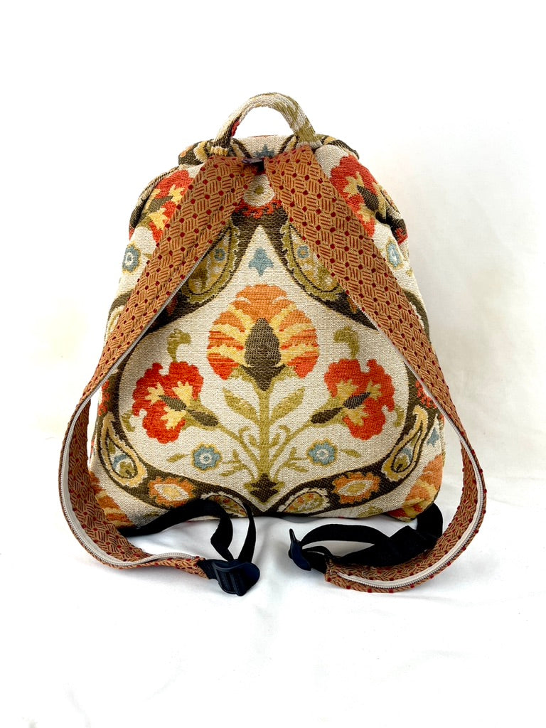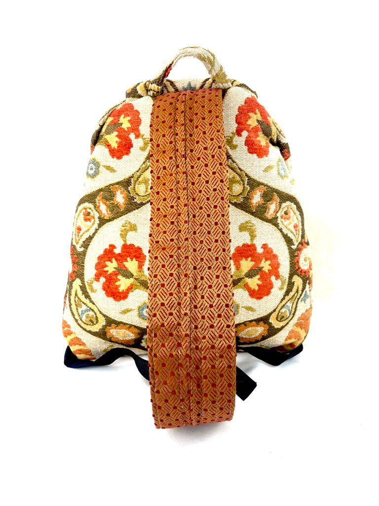 This Large Backpack is made in our ivory background floral tapestry. This formal weave has three flowers in yellow, gold and tangerine which are framed in a brown figured border. Other colors are Prussian blue, plae green and peach. Lined in red.