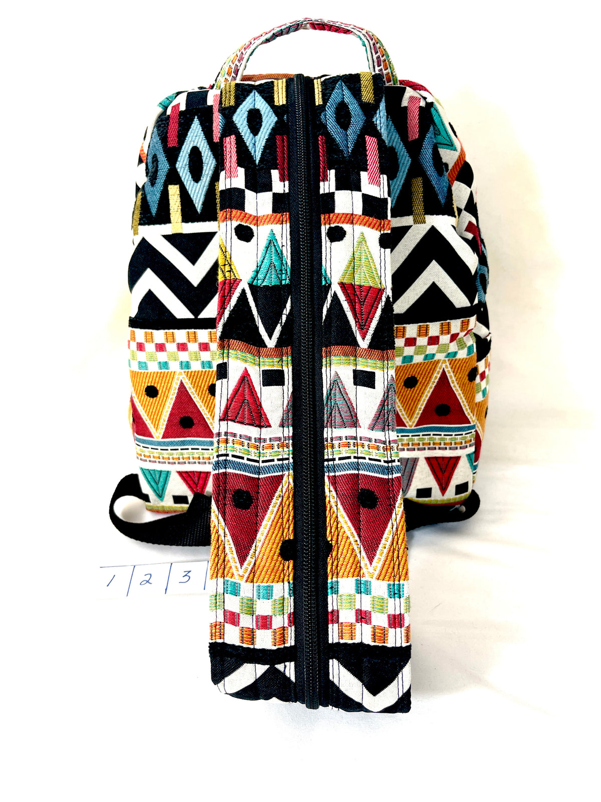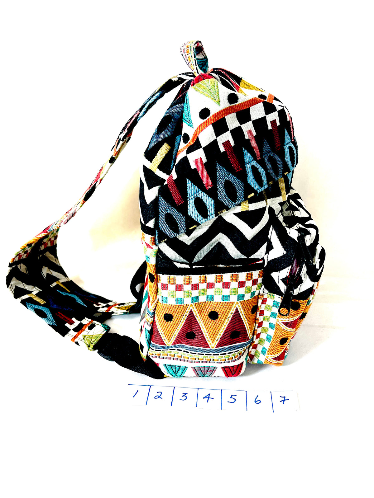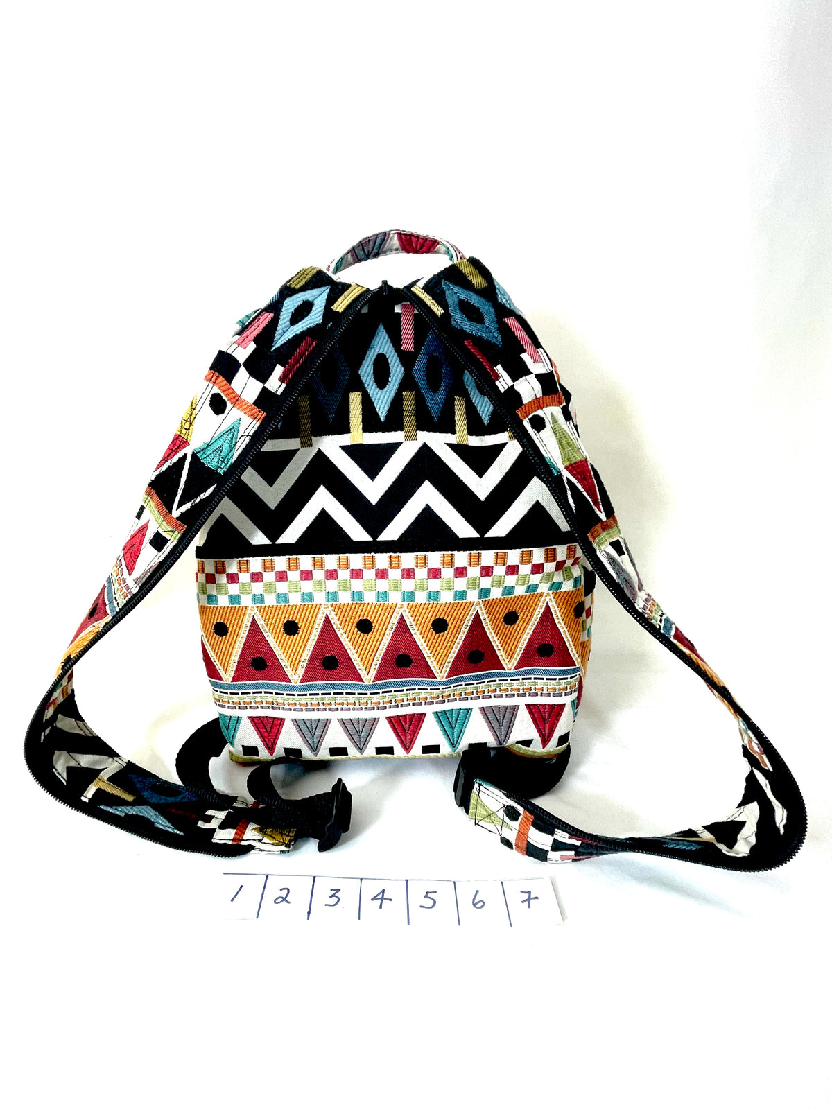 This Medium Backpack is made in our bright and colorful banded geometric jacquard which has textured bands of zig-zag patterns in black and white, black chenille bands with blue diamonds, multicolored checkerboard bands, bands with multicolored diamonds and black dots. Lined in red.