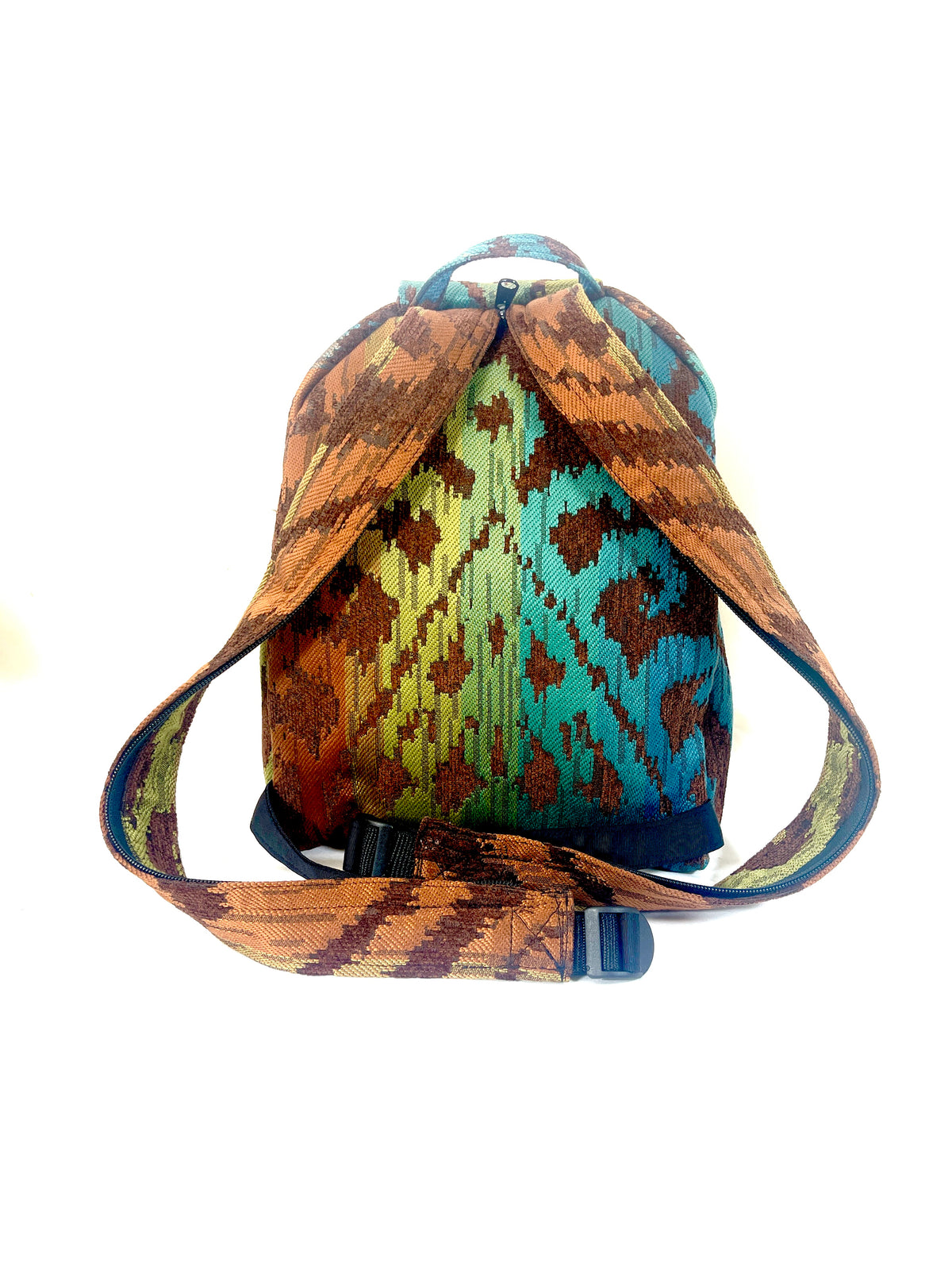 This Medium Backpack is made in our low pile chenille fabric that is a blend of colors that recalls iridescence. On a chestnut brown background are woven abstracted botanical figures in turquoise, amber and gold tints. Lined in burgundy.