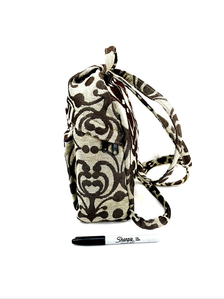 This Small Backpack is woven with a satiny bronze arabesque pattern and is cut to emphasize the symmetry of this lovely pattern. The background is a an open weave in gray that has subtle hints of blue and beige. Lined in Indigo.