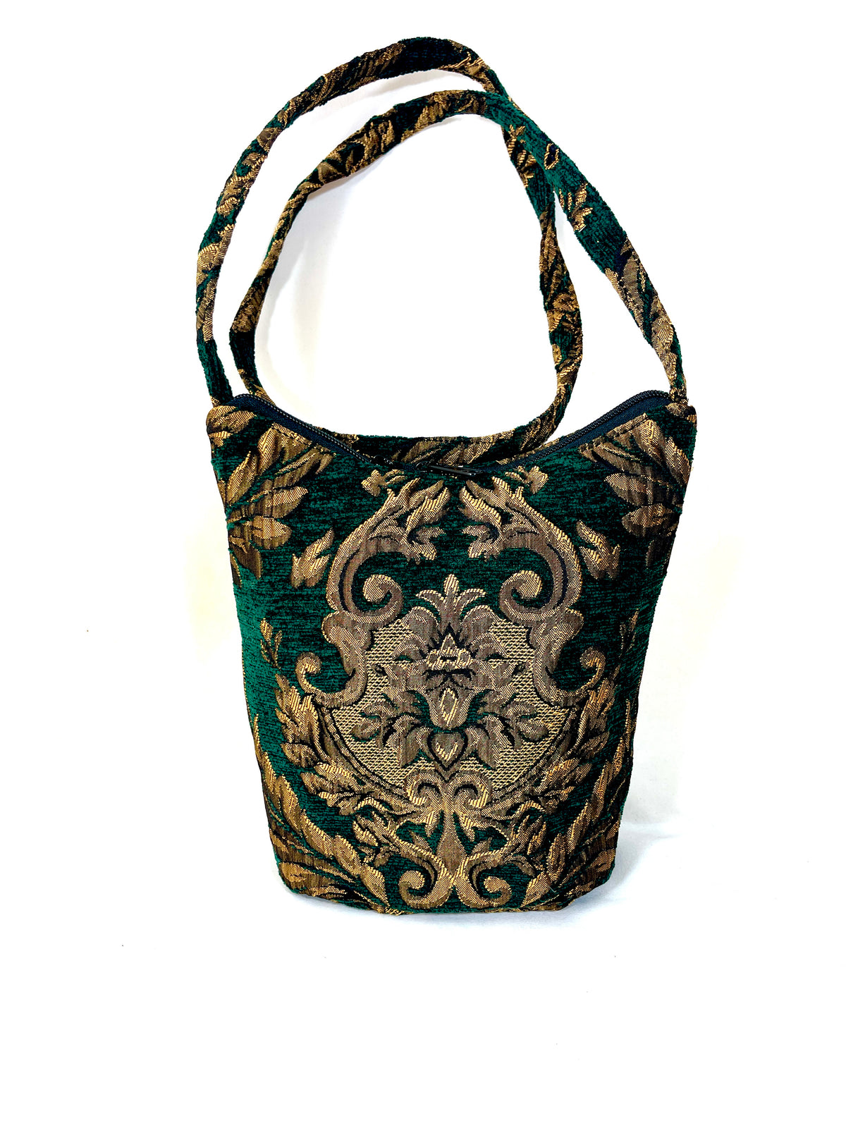 This Bucket Purse is made in our royal green textured tapestry fabric. This classic weave had a formal artichoke flower pattern in golden bronze emphasized with black on an emerald green chenille background. Lined in black.