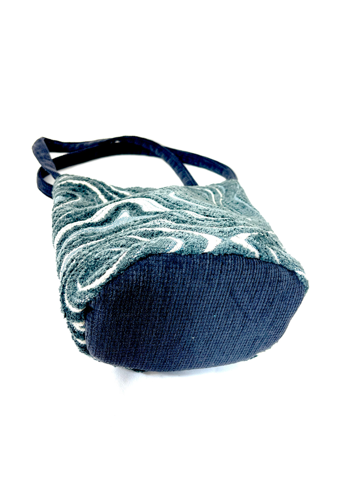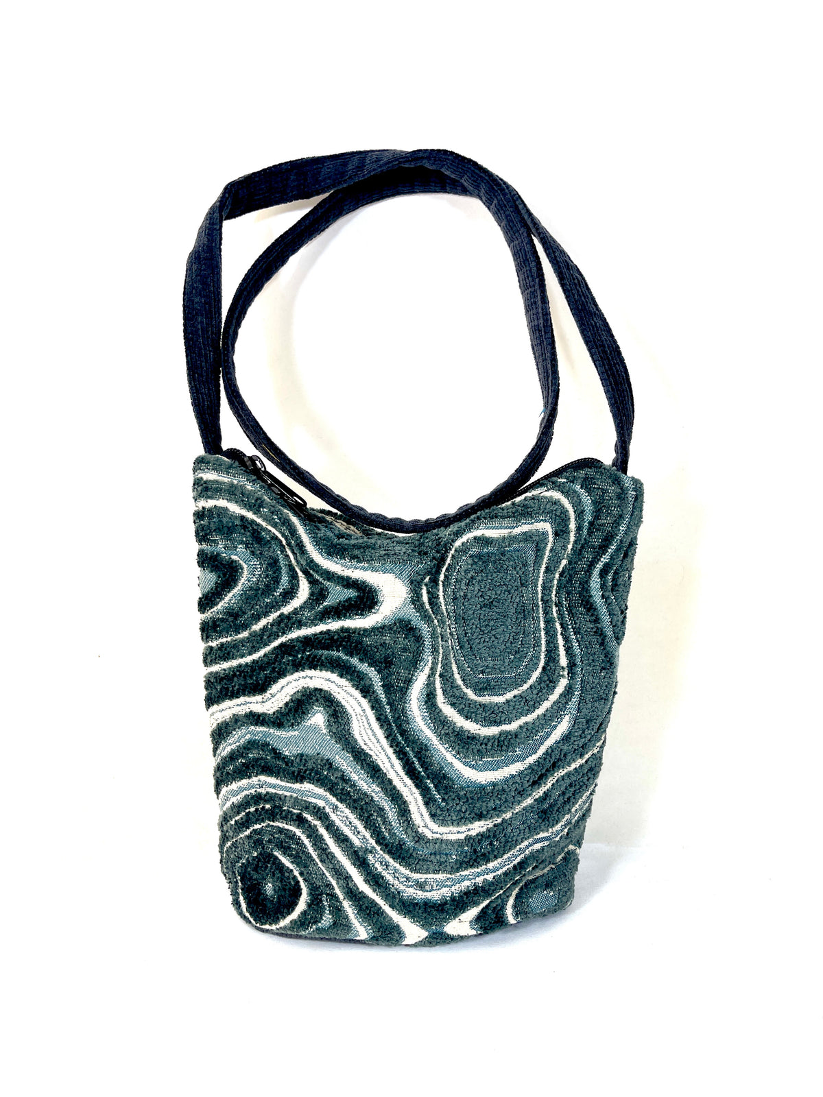 This Bucket Purse is made in our substantial grey agate chenille fabric. Soft, rounded, layered and textured shapes in grey hues bordered in ivory comprise this weave. The shoulder strap and base are made in a coordinating dark grey chenille. Lined in black.