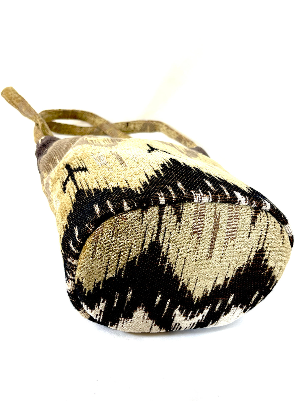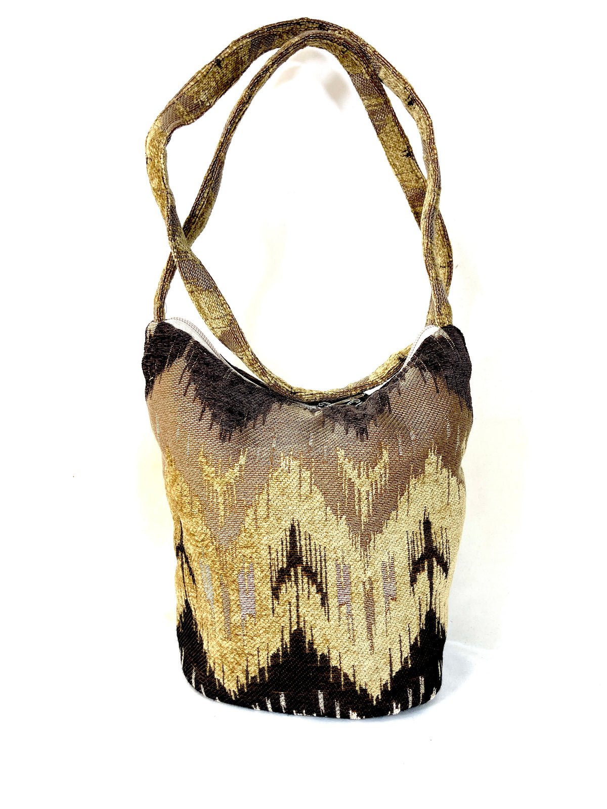 This Bucket Purse is made in our Winter on the Mesa geometric weave. Broad textured zig-zag patterns go across the bag in brown, ivory, and and beige. Lined in black.