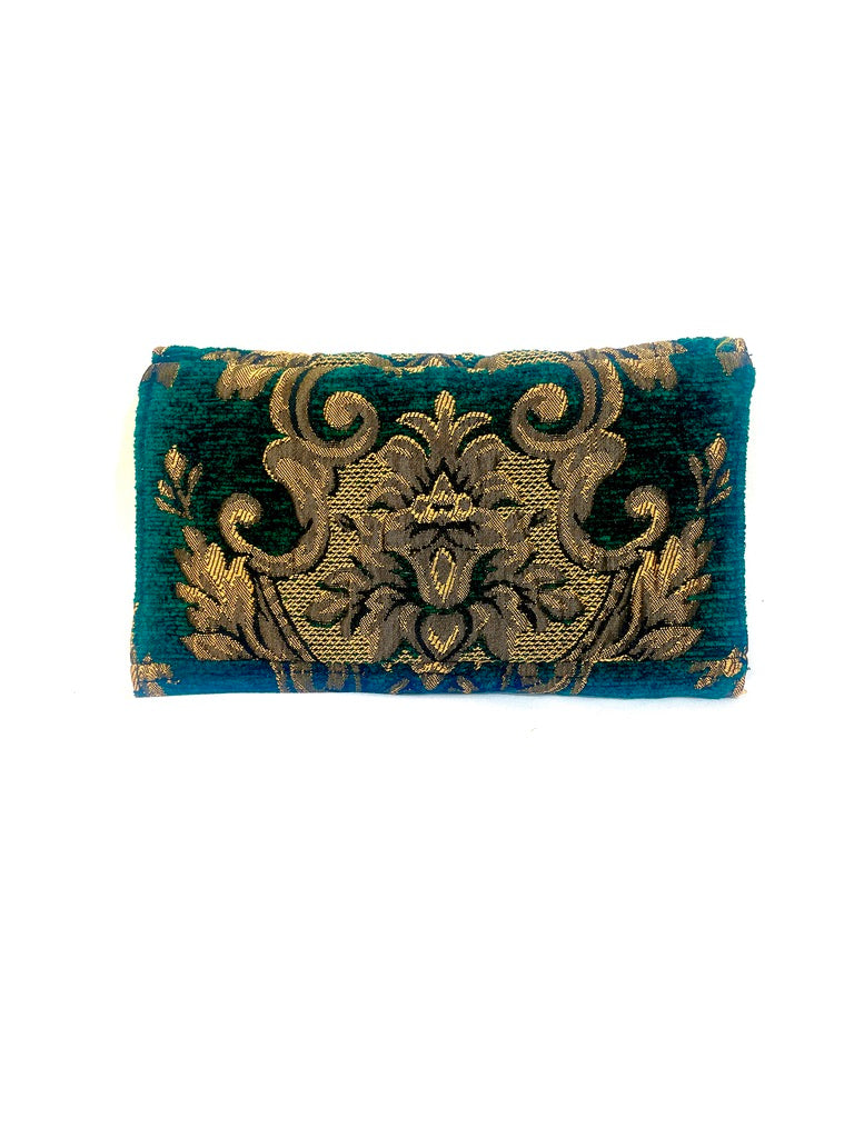 This magnificent weave has a formal botanical pattern in gold, and black with a smooth texture on a background of emerald green chenille. Lined in Black.