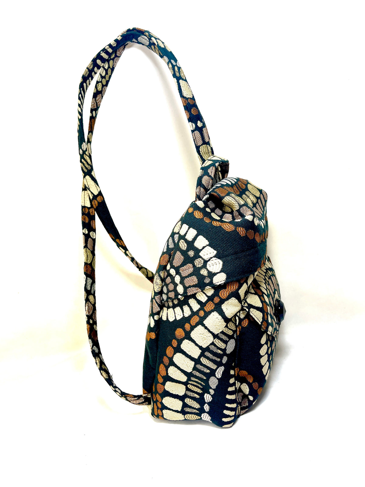 This Small Backpack is made in our Earthen Mandala Tapestry which has a circular pattern in copper, tan, rose-beige and light gold on a black background. Lined in black.
