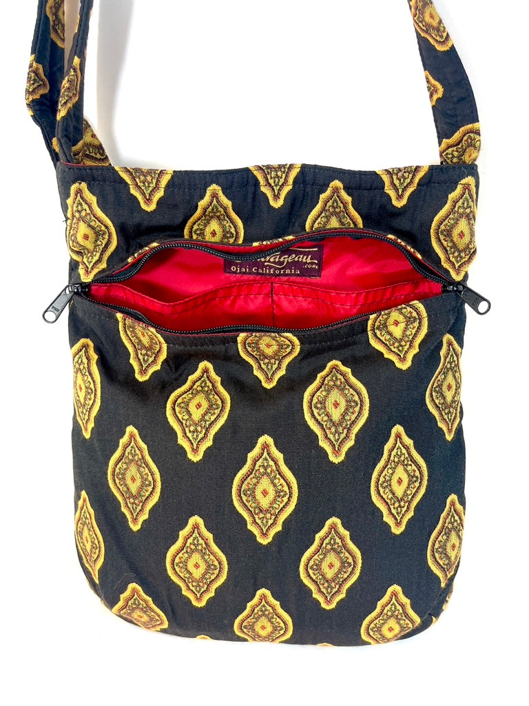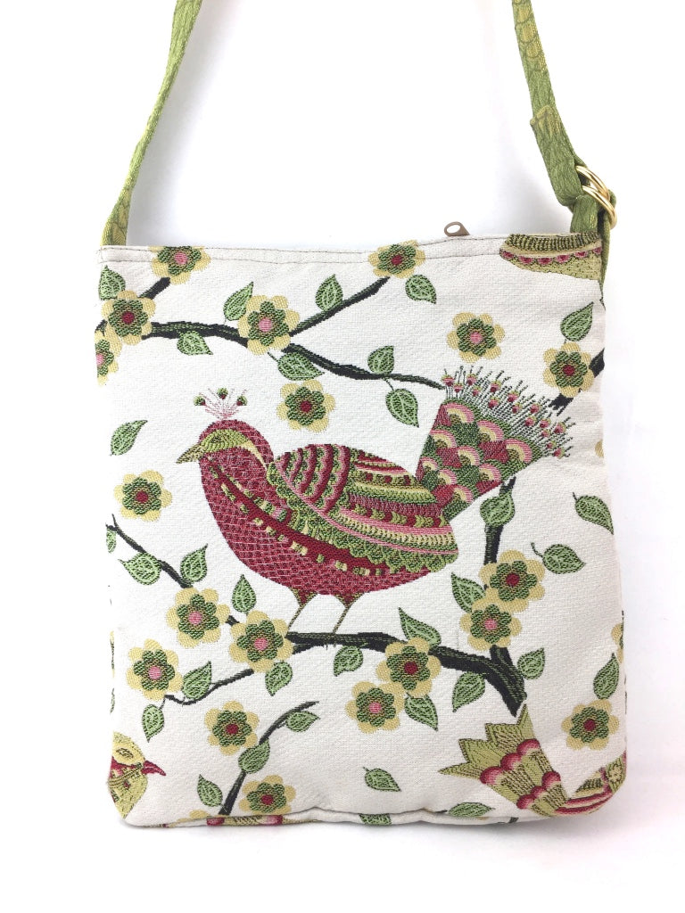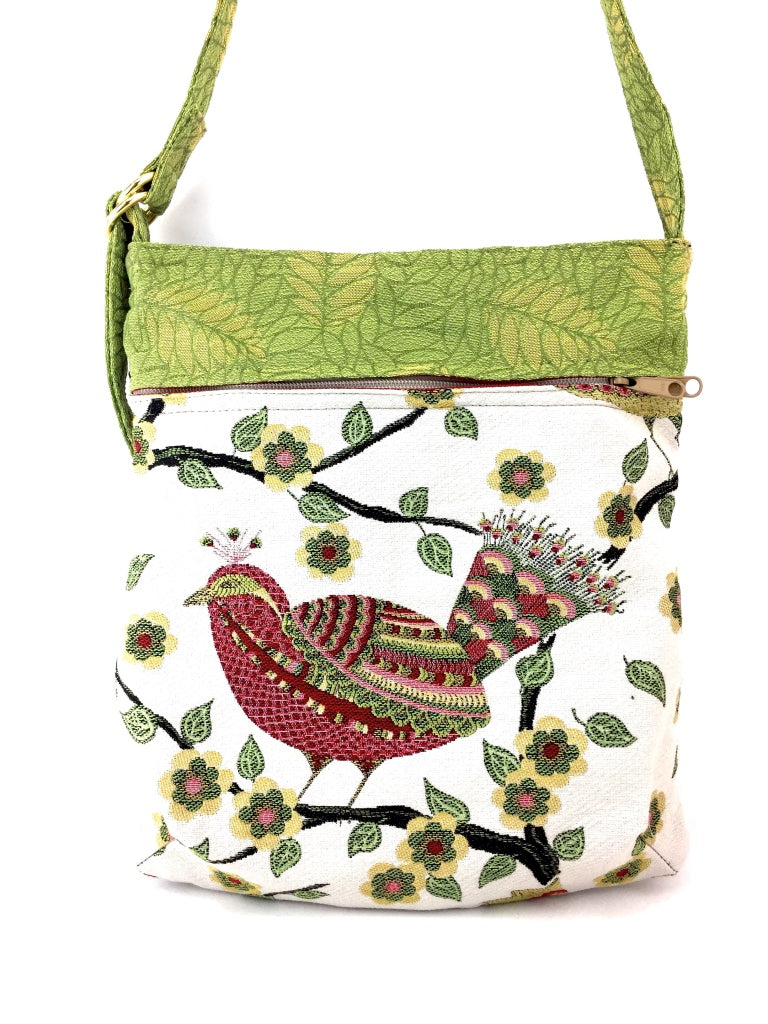This tapestry shoulder bag has two vertical compartments that close with zippers and are lined with our waterproof nylon lining fabric. The zippers have two sliders so they can be opened from either side. The front compartment zips across the front with two pockets inside just behind the opening and is larger at the bottom to hold more incidentals.