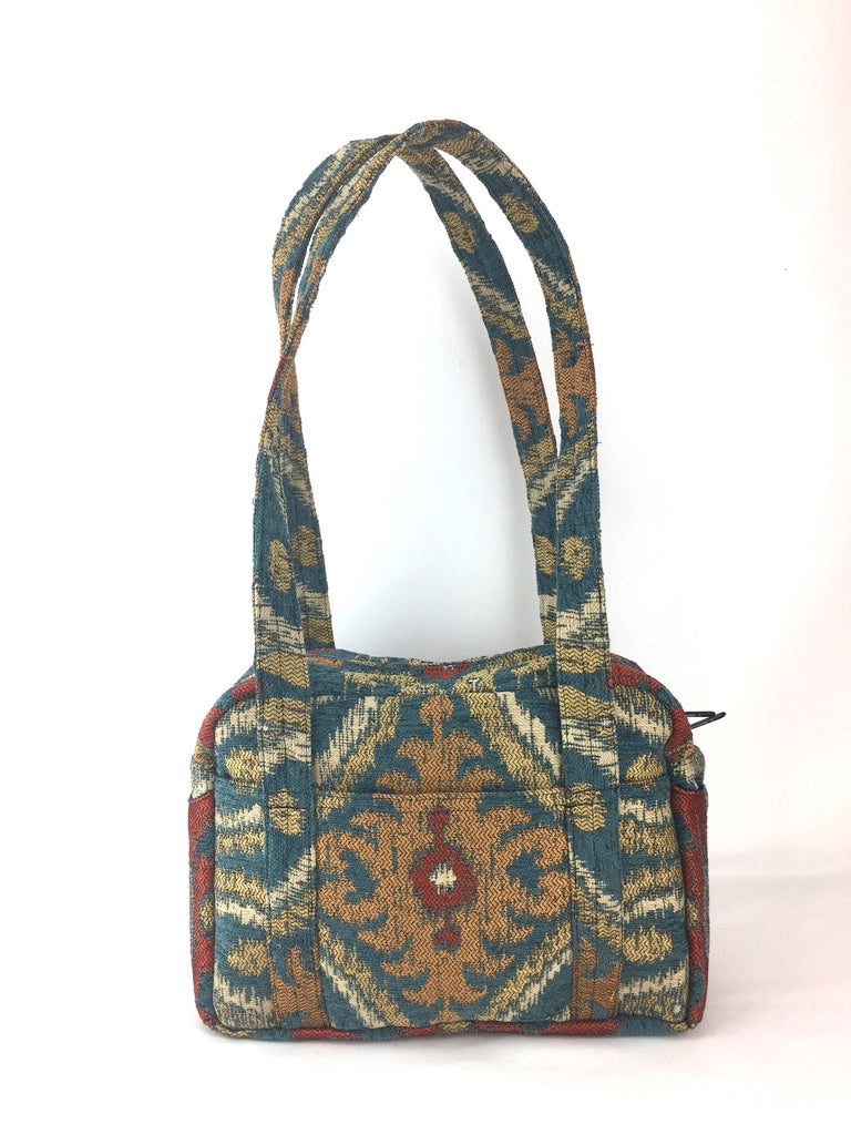 The two fabric handles also fit over your shoulder.  This tapestry purse sits against your side just above your waist for secure and comfortable carrying. You can slip one handle off your shoulder while keeping the other one on and access the interior of your bag without taking it off your shoulder.