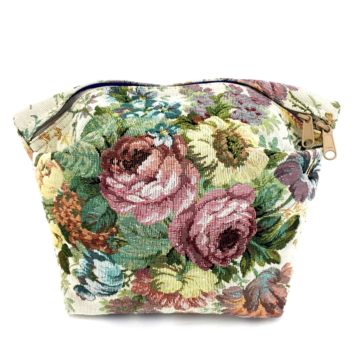The rectangular flat bottom creates a base to firmly stand on so the Cosmetic Bag does not fall over when you are using it. The zippered opening is across the top front for easy accessibility of your toiletries. The top of the bag has a pleat for more packing room. The Cosmetic Bag is lined with our durable, waterproof lining fabric and it will hold regular size bottles of shampoo as well as many other items.