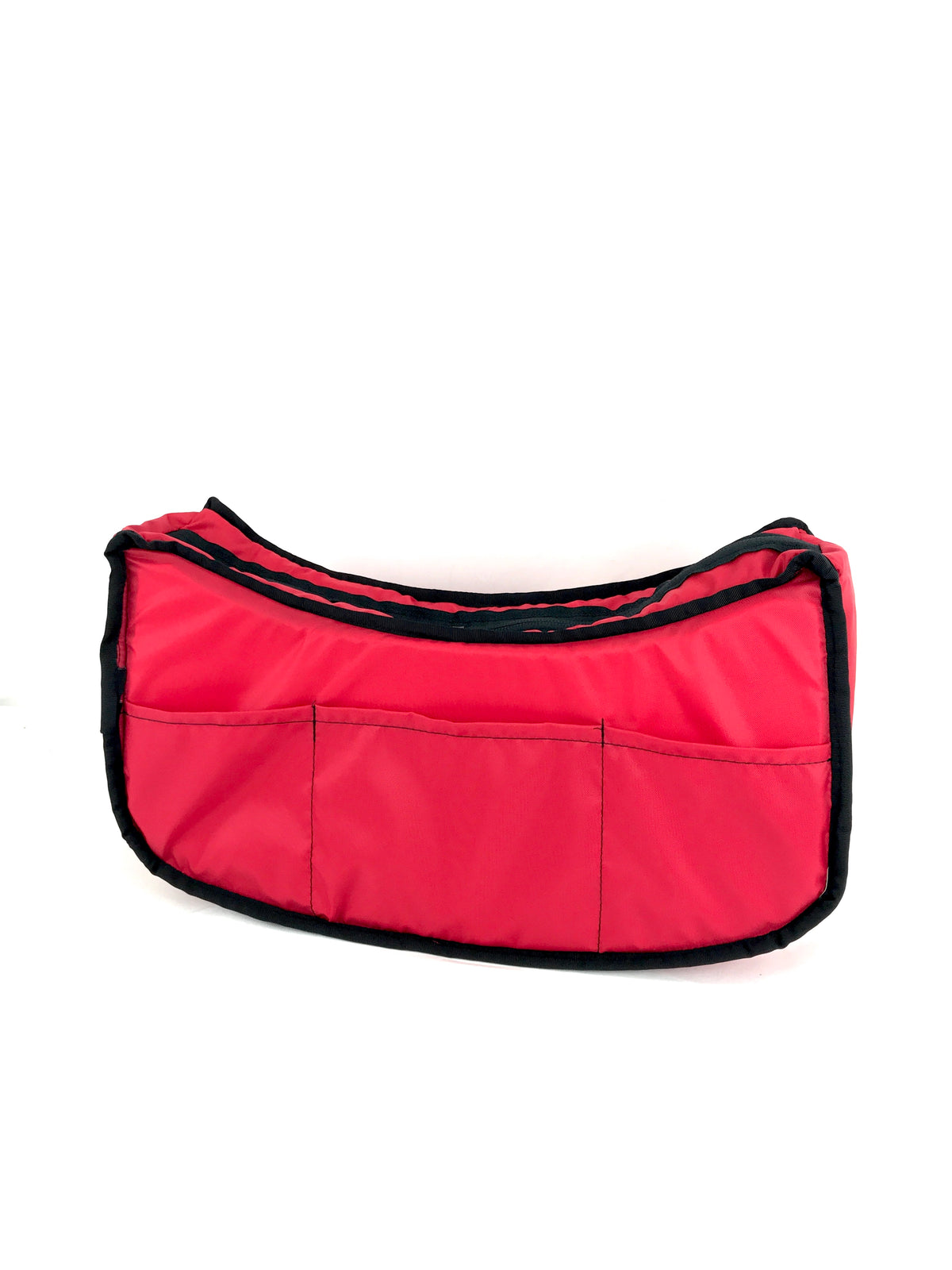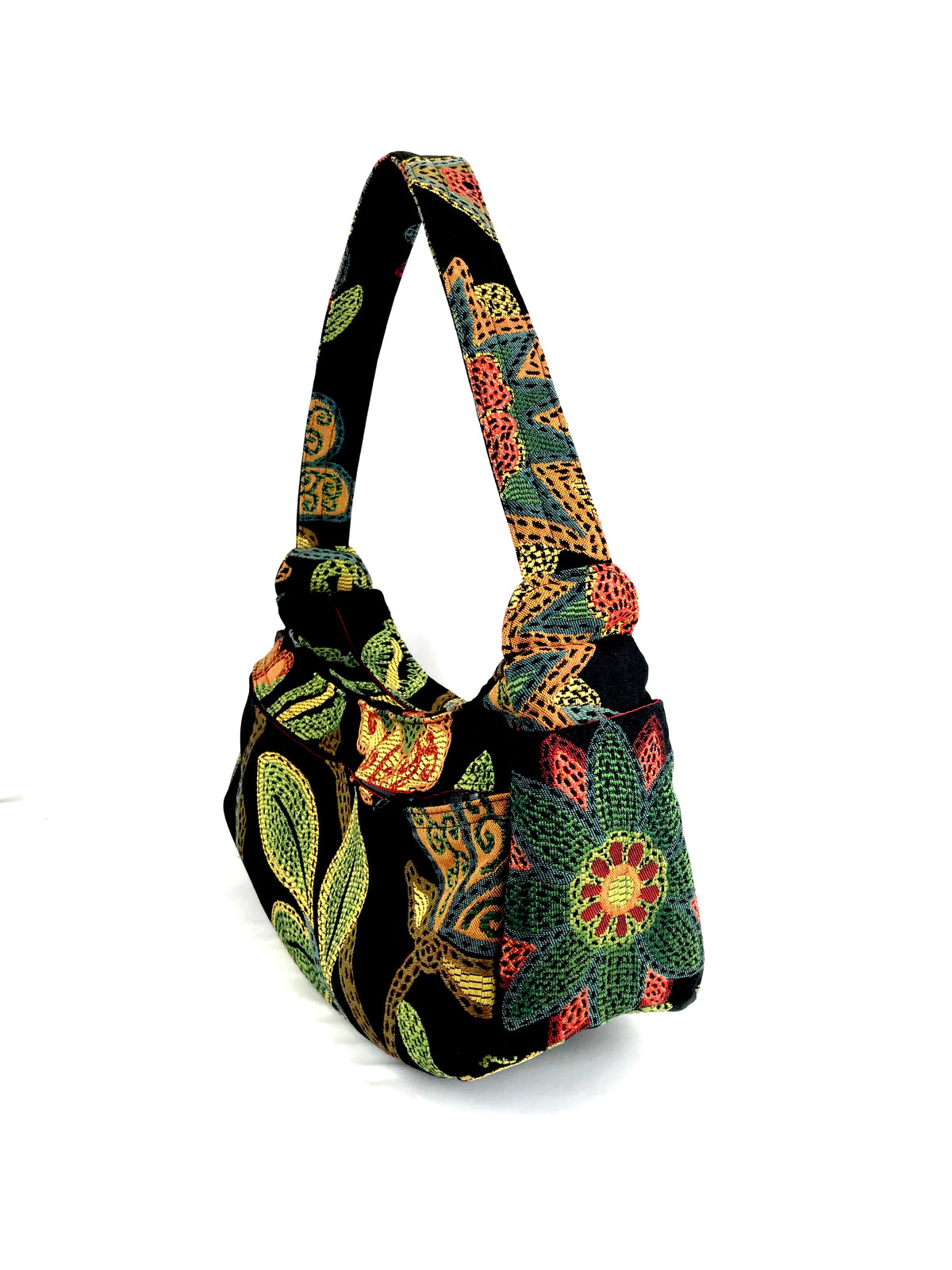 The exterior of the bag has many pockets to help you organize your daily essentials. One side has 2 flat pockets so you may slip your things inn and out easily. The opposite side has a large, voluminous zippered pocket that acts as a separate compartment. The main body of the bag has a zippered top opening and 5 interior pockets, 2 pockets on one side and on the opposite side 3 pockets. This bag is shaped with our firm yet flexible structuring material, which provides a firm shape while still allowing for machine wash-ability. The shoulder strap is 1"-wide and this purse sits comfortably over your shoulder, just above your waist.