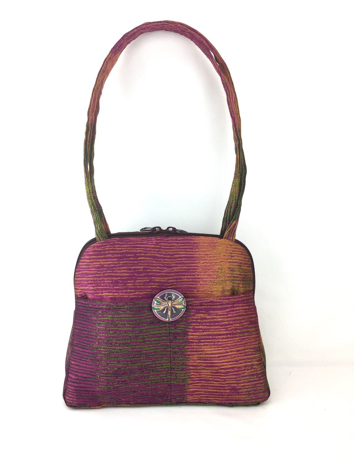 The Evita Grande Bag is a favorite for women who are looking to size down yet is stylish enough for an evening out.  Designed to be elegant yet practical with two exterior for cell phone and glasses and two interior pockets for organizing your essentials. It is lined with our durable, waterproof lining fabric in colors that coordinate with the fabric. The handles fit over your shoulder while this tapestry shoulder bag nestles comfortably against the contours of your body. The top opening secures with a zipper closure which has two pulls for convenient opening and closing from either end.  The removable hard base provides a flat bottom and ensures that the bag remains upright when set down.