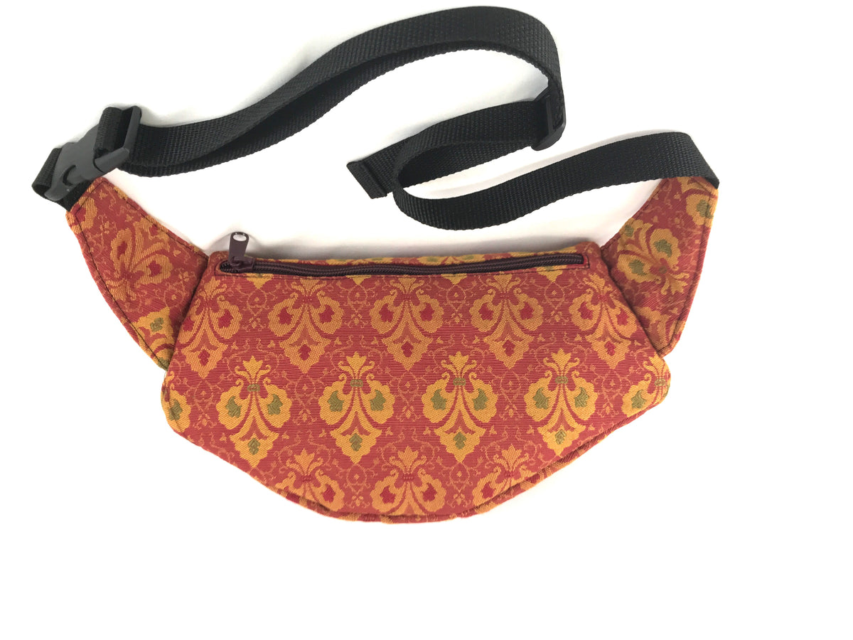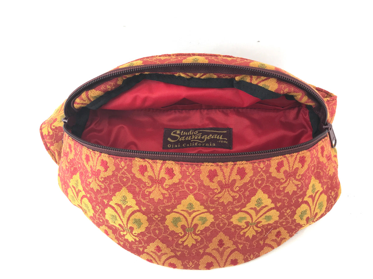 The Small Hip Bag has a covered zippered opening across the front and a large interior compartment. The back, which is against your body, has a secure zipper pocket for stashing your money or passport when traveling. Fully lined with our durable, water-resistant lining fabric in a beautiful coordinating color.