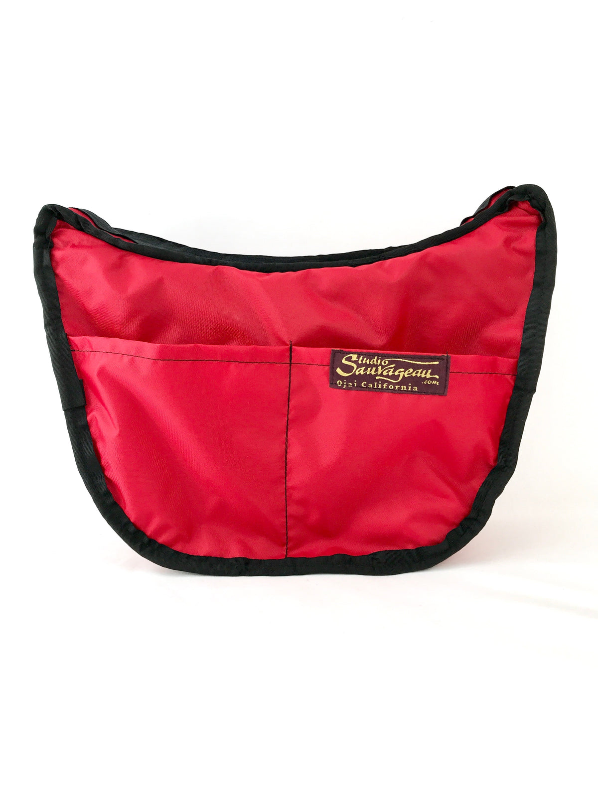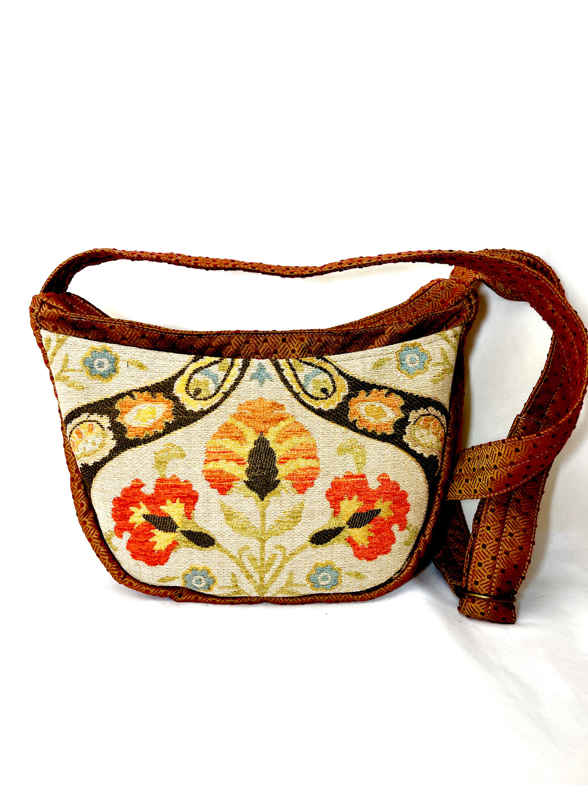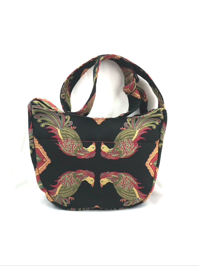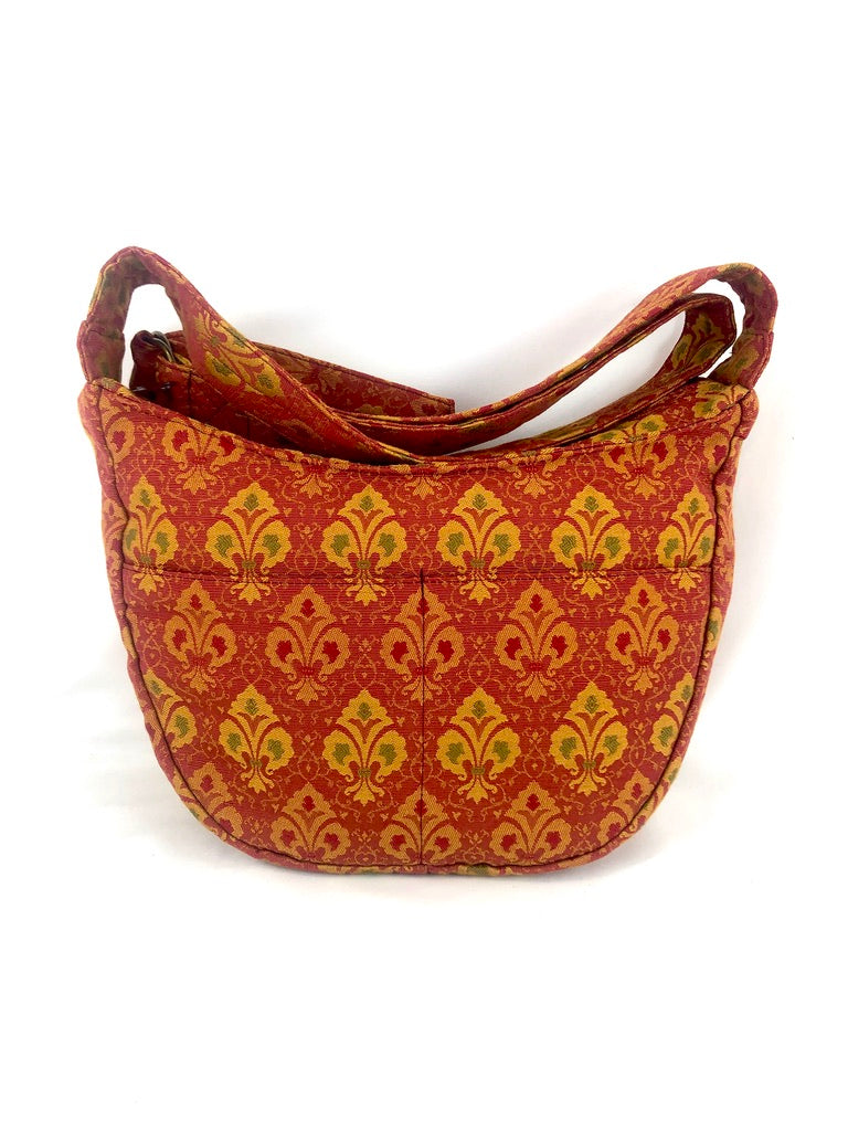 The Hobo bag has three exterior pockets: Two on one side and a single, large pocket on the opposite side which is tacked closed with a velcro tab. Cell phone, keys and/or glasses can be placed in each of the smaller pockets and the larger pocket is large enough to hold a paperback book. There are three interior pockets: Two on one side and a large pocket on the opposite side with a zipper closure. This tapestry purse is fully lined with our waterproof nylon lining fabric in Bright Red.