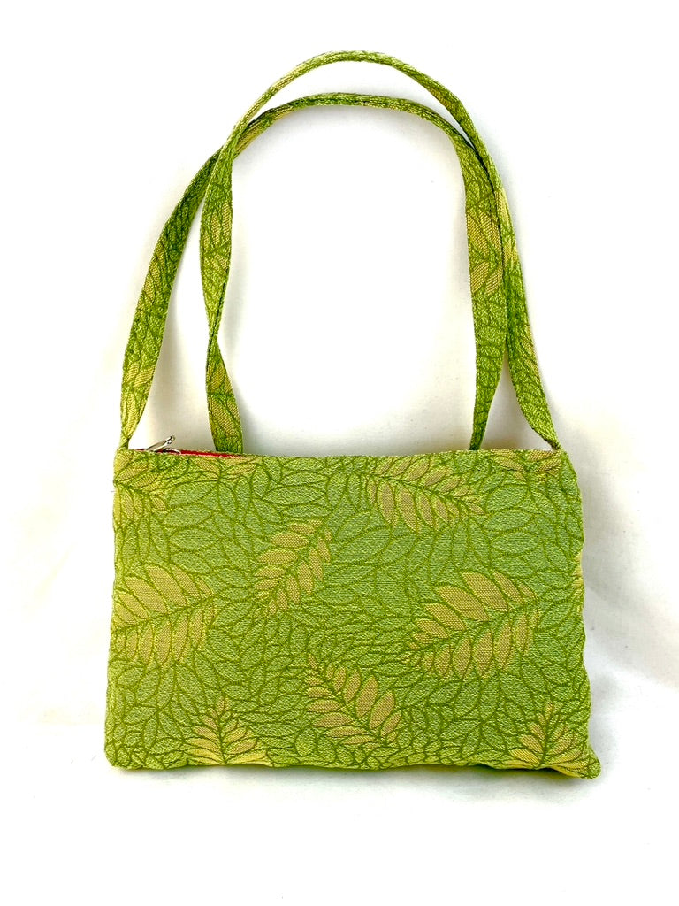 This Frida Bag is made on bright green tapestry with lighter and darker green patterns making the background upon which are scttered fronds of ferns. Lined in hot pink..