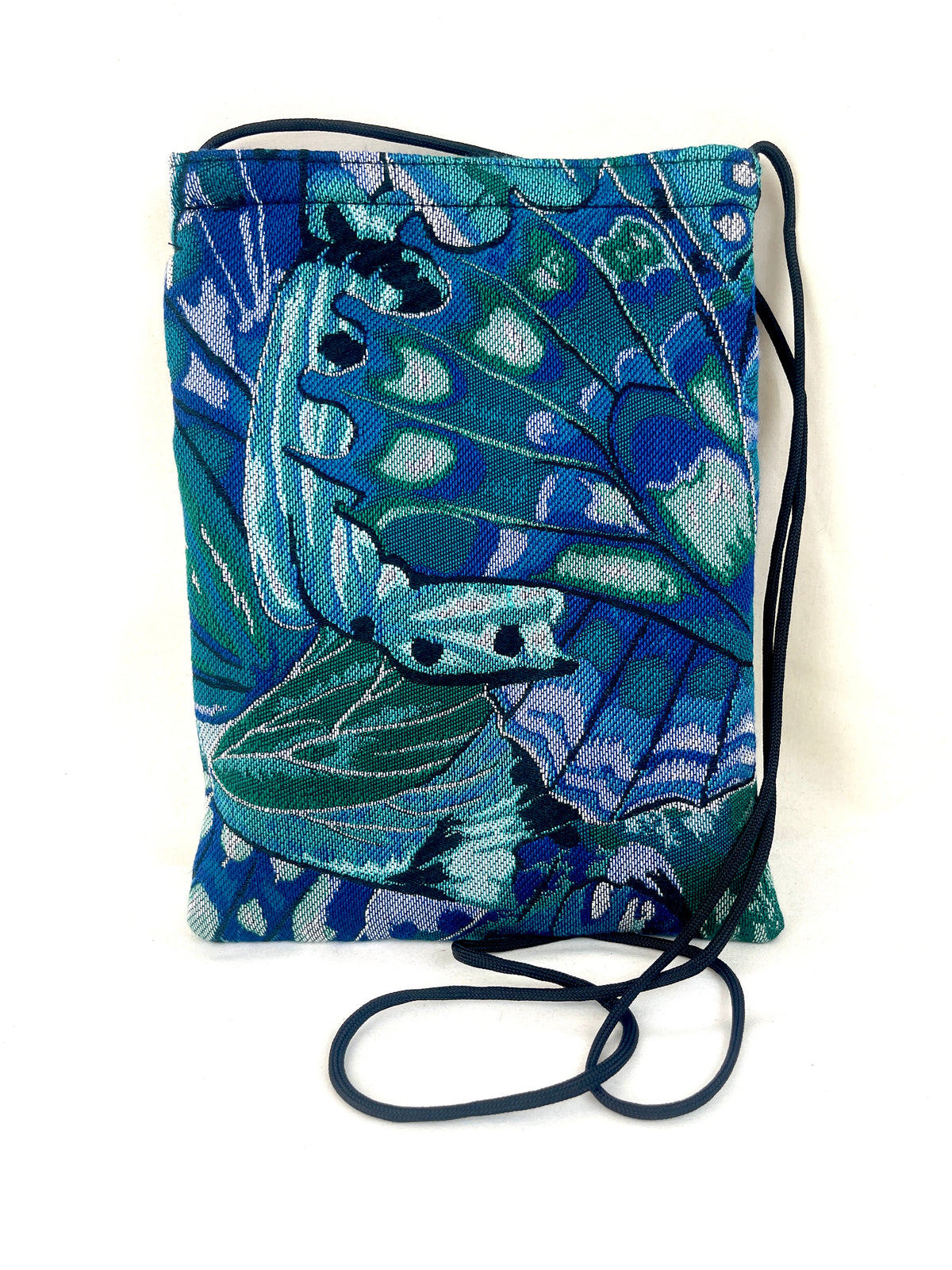 This Patch Purse is made in our blue butterfly wings tapestry fabric. It’s a lovely mid to heavyweight tapestry fabric with an array of blue butterfly wing patterns scattered all over the fabric. The colors are royal blue, mid blue, turquoise, light, blue, jade, green, and black. Lined in Indigo.