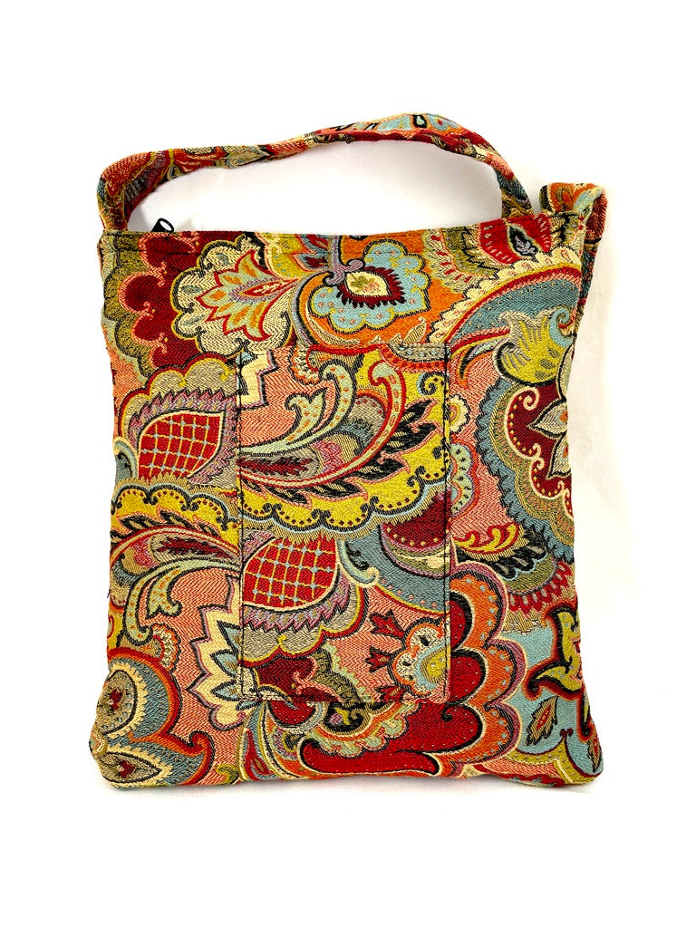 This tapestry shoulder bag has two vertical compartments that close with zippers and are lined with our waterproof nylon lining fabric. The zippers have two sliders so they can be opened from either side. The front compartment zips across the front with two pockets inside just behind the opening and is larger at the bottom to hold more incidentals.