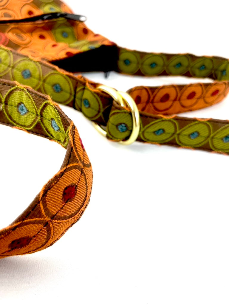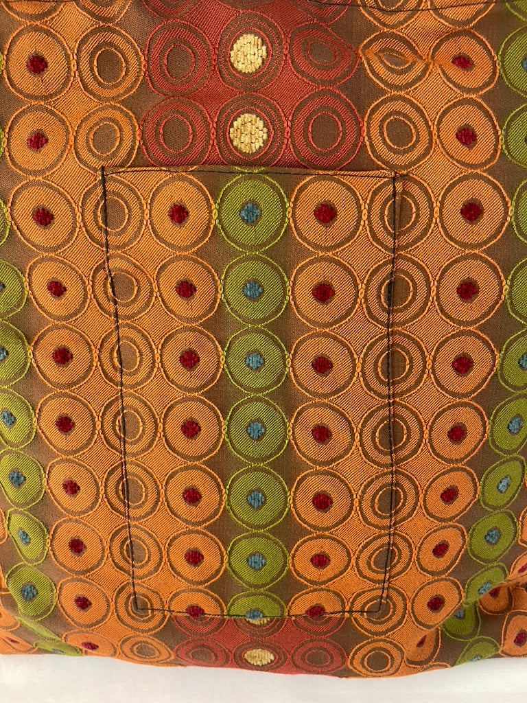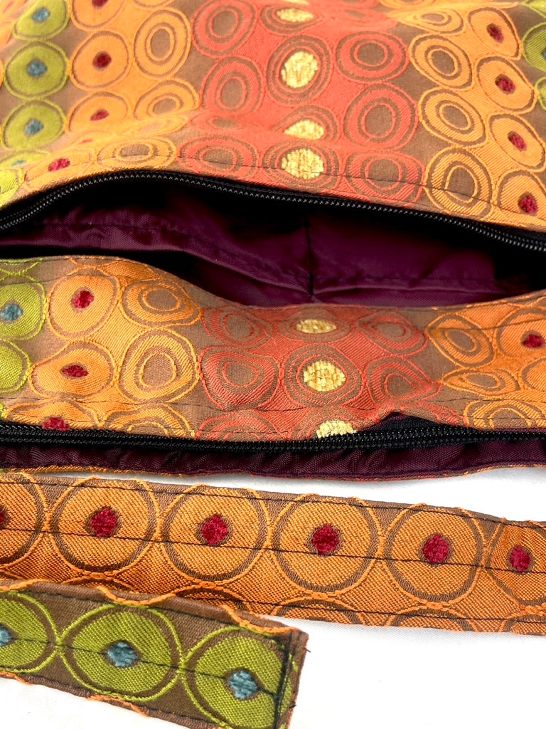 This Urban Portfolio is made in our orange, russet-red and green dot-patterned jacquard. Chenille centers in the dots add texture to this vintage weave. The straps are sewn with the green dots on one side, orange on the other. Lined in burgundy.