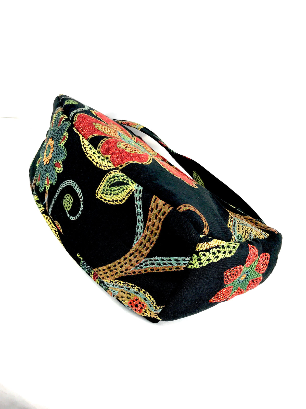 This larger purse can carry many things but as soon as you put it on your shoulder, it feels much lighter. This tapestry purse is one of our structured bags, and this and the broad boat shape and wide shoulder strap (1 3/4" wide) distribute the load in this bag making it feel significantly lighter when you carry it.