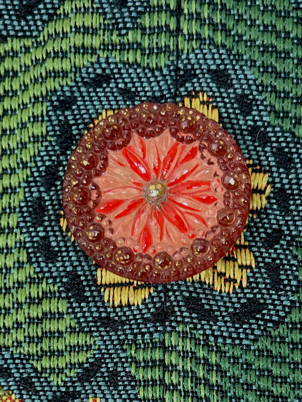 River Sauvageau sources unique buttons for the Evita Grande Bag. Each button is carefully chosen to alchemically enhance the pattern and colors of the fabric, bringing out the inherent beauty of the design.