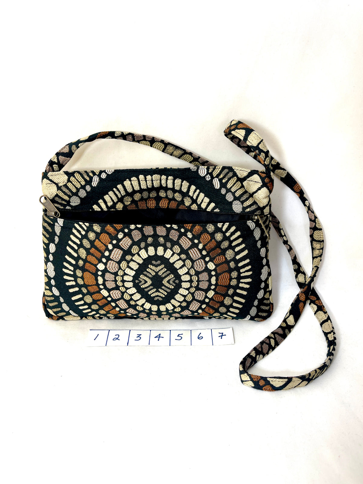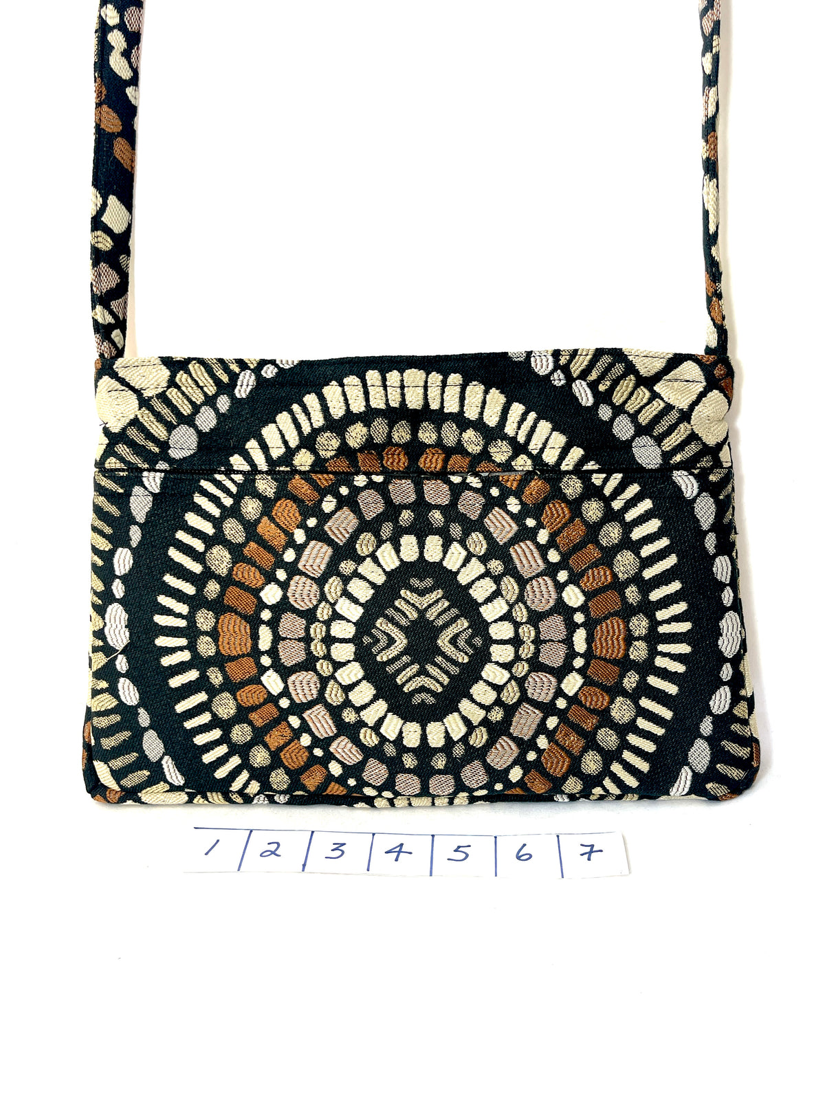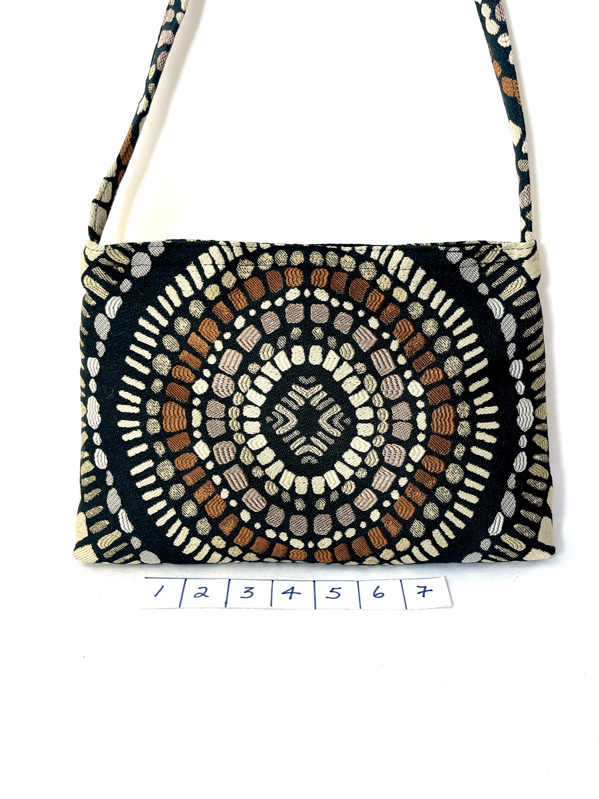 Woven with circular patterns in earthy shades of brown, beige, tan and ivory on a black background. Lined in black.