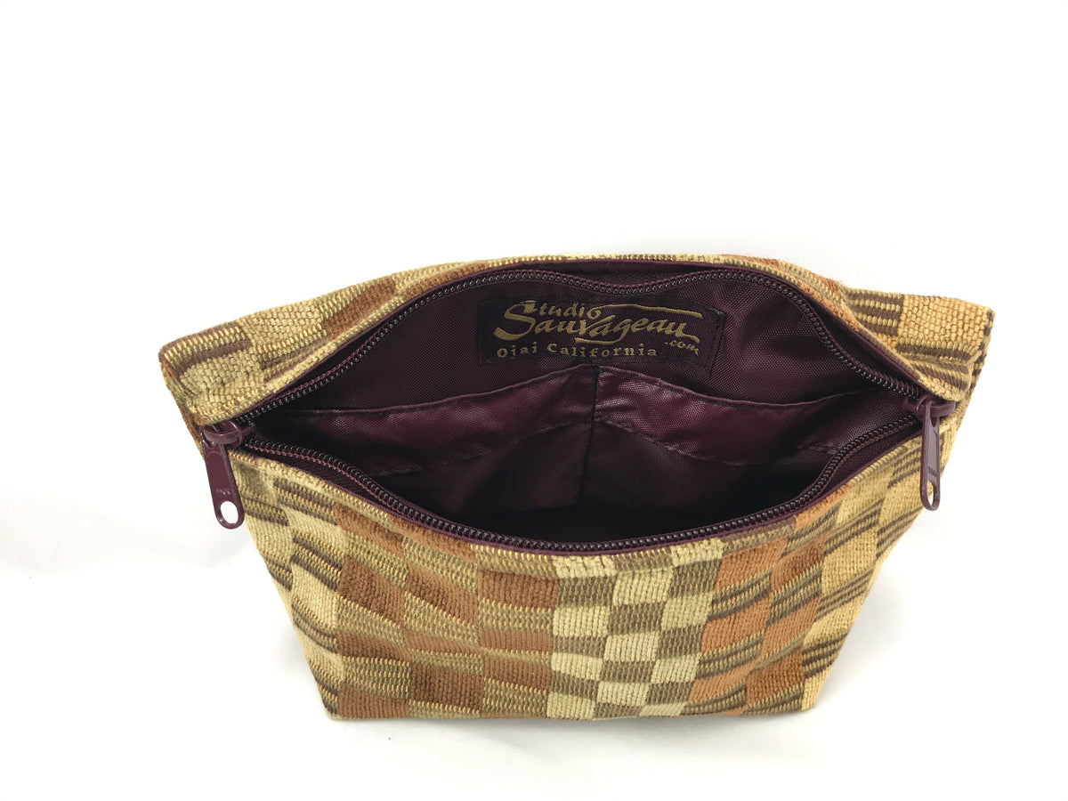 This Jewelry Bag made in our soft low pile tapestry in wood colors. The colors are browns, russets, gold-beige, tan and sage. Lined in Burgundy.