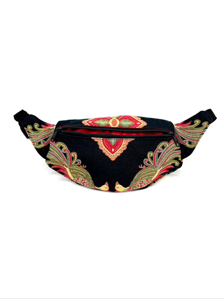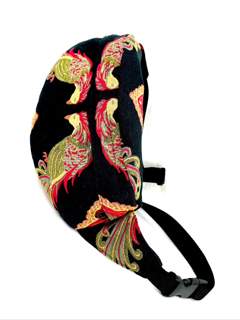 Made in in our Formal Bird Tapestry which has a black background and a formal pattern of stylized birds with a central medallion. The front features four bird heads converging while the top features the medallion. Lined in our red waterproof lining fabric.