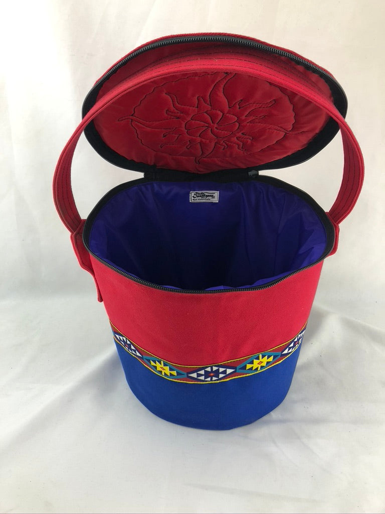 The Water Drum Bag will fit a size 6 or 7 quart kettle. Typically made with 15 oz canvas in red and blue these bags are made to be used for many years to come. They are lined in a water resistant nylon fabric.
