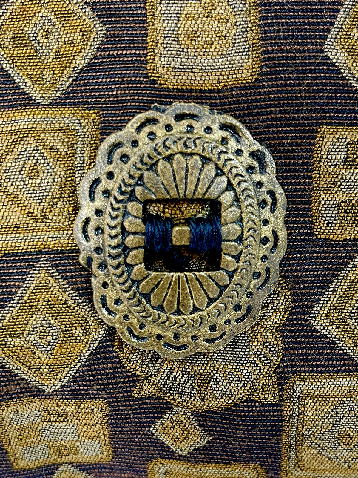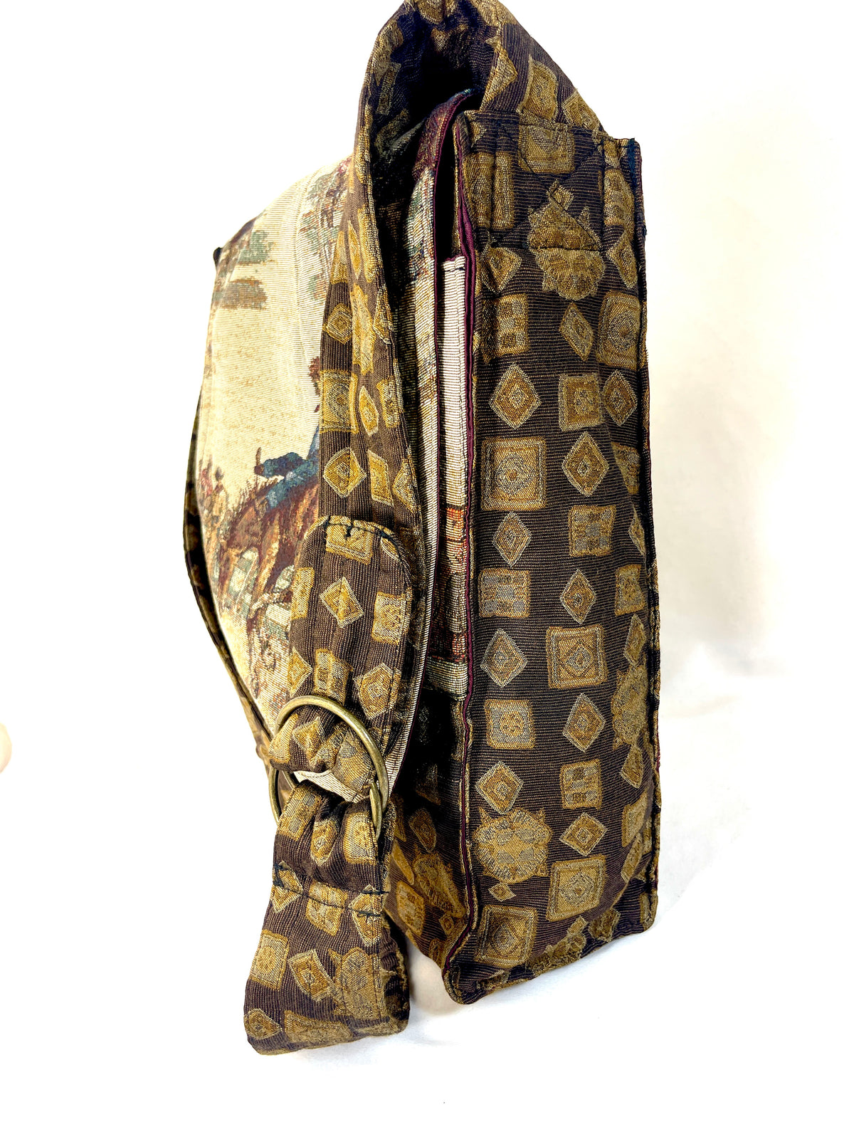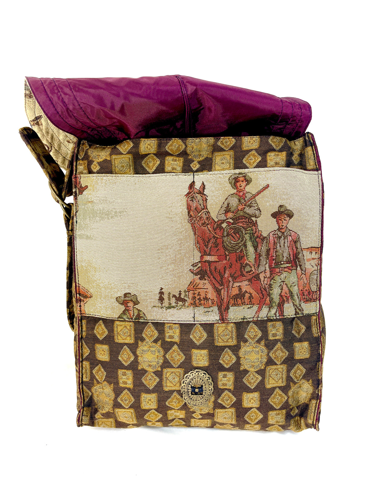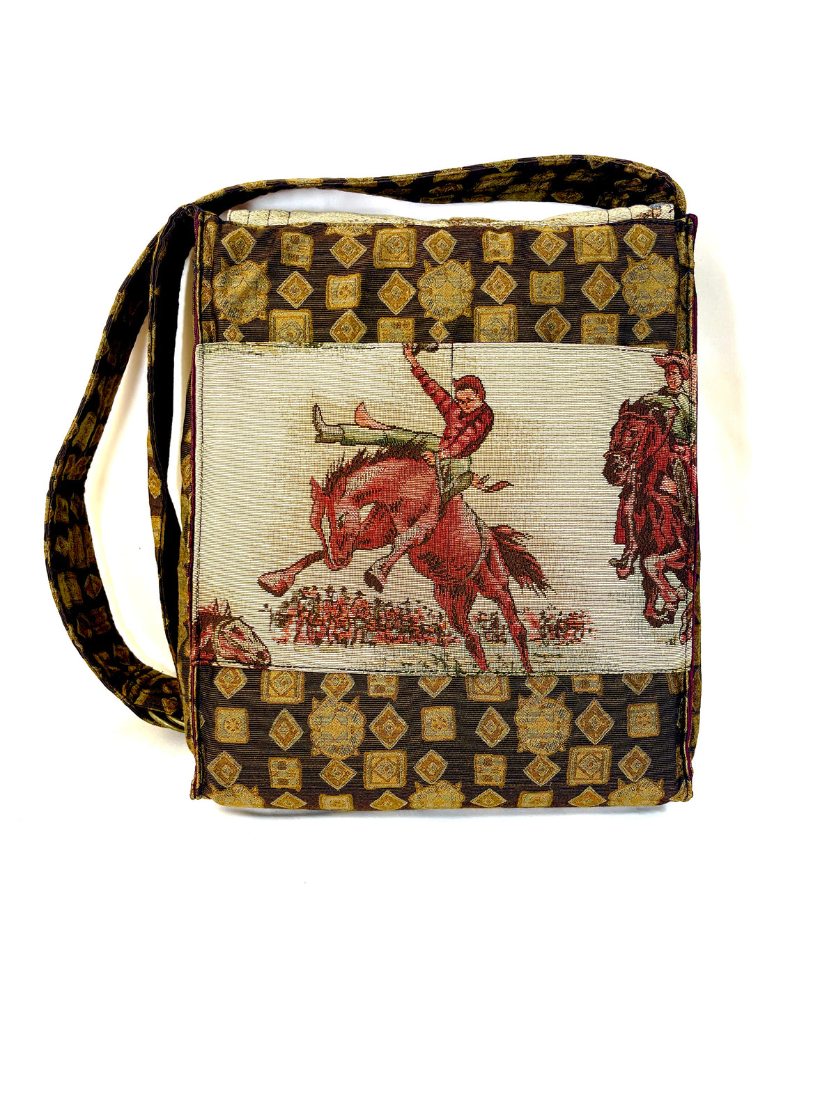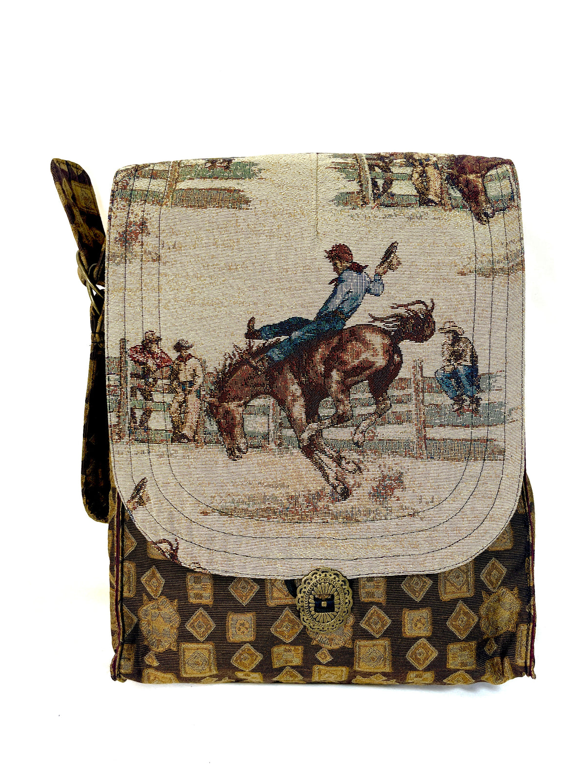 This Large Flap Bag has a bucking bronco on the flap in front which covers a double pocket that has a pictorial weave of two cowboys, one mounted on a horse. The coordinating fabric is a men's tie pattern in browns, bronze and grey. The back pockets have a boy on a bucking bronco with a crowd in background and a horse and rider to the side. Secured with a buckle style button. Lined in burgundy.