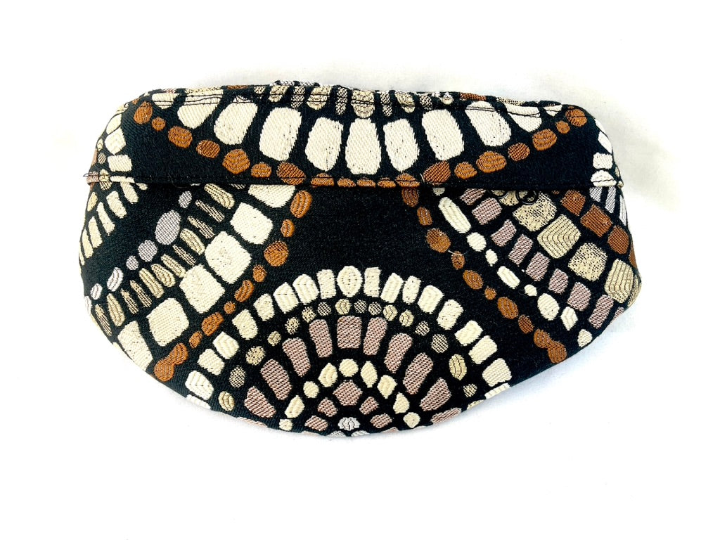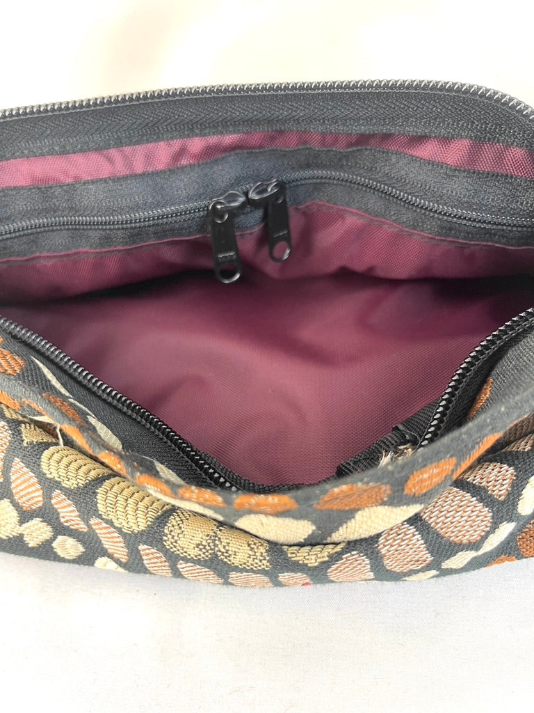 This Small Hip Bag is made in our Earthen Mandala Tapestry which has a circular pattern in copper, tan, rose-beige and light gold on a black background. Lined in burgundy.