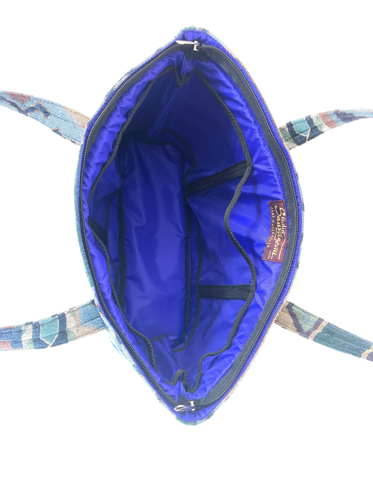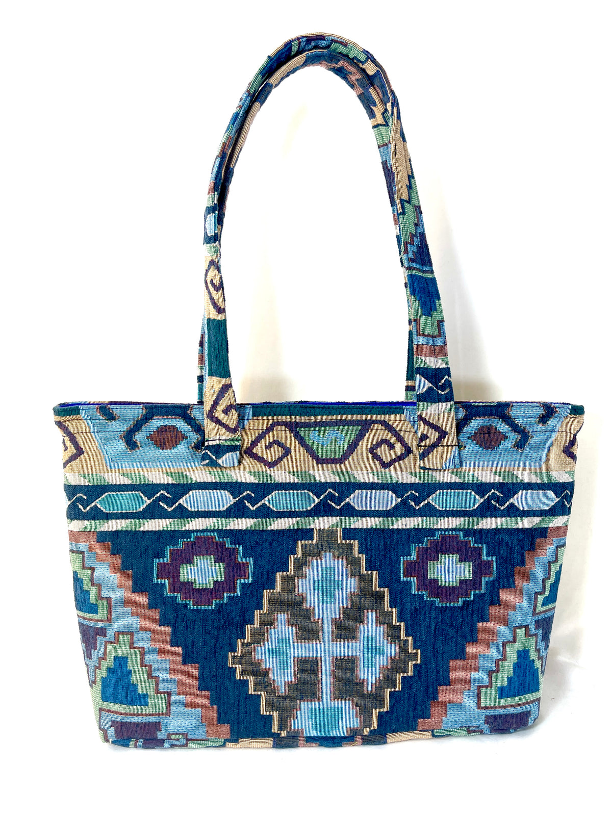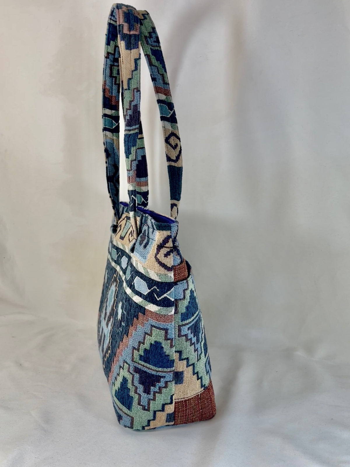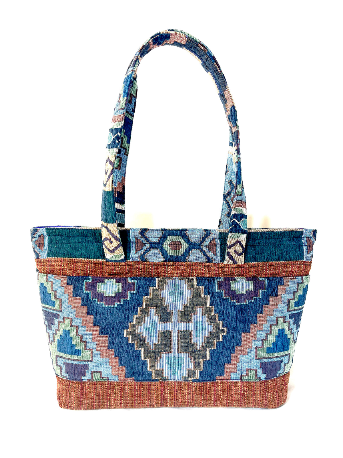 The fabric of this Marilyn Bag is made with our substantial geometric tapestry which has a mix of textures and colors which include grey-blue, sky blues, peach-gold, sage greens, brown, white and burgundy reds. Complimented with a textured jacquard fabric woven in tints and shades of russet. Lined in indigo.