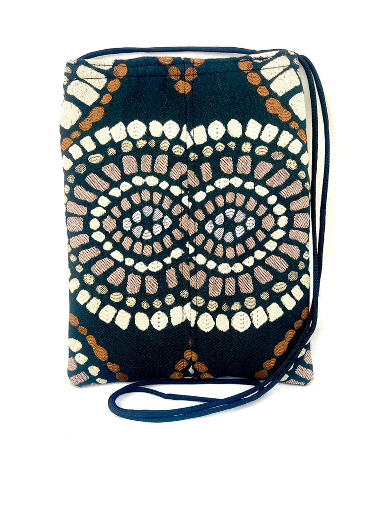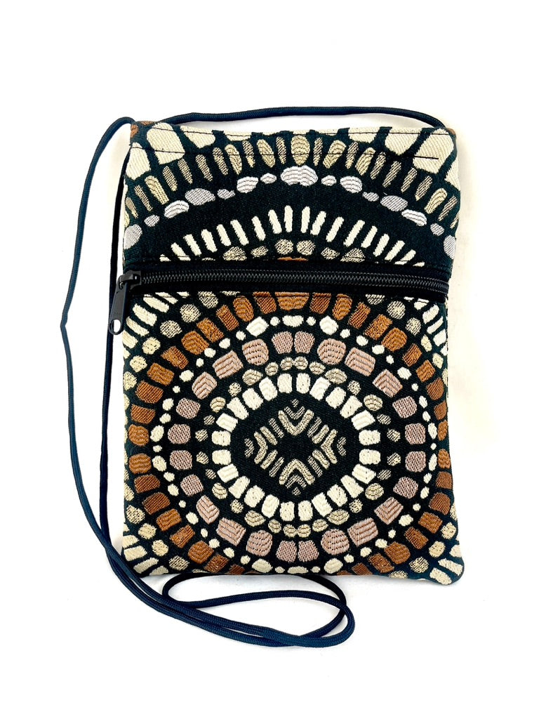 This Patch Purse is woven with circular patterns in earthy shades of brown, beige, tan, copper and ivory on a black background. The back is pieced to look like owl eyes. Lined in black with a black cord.