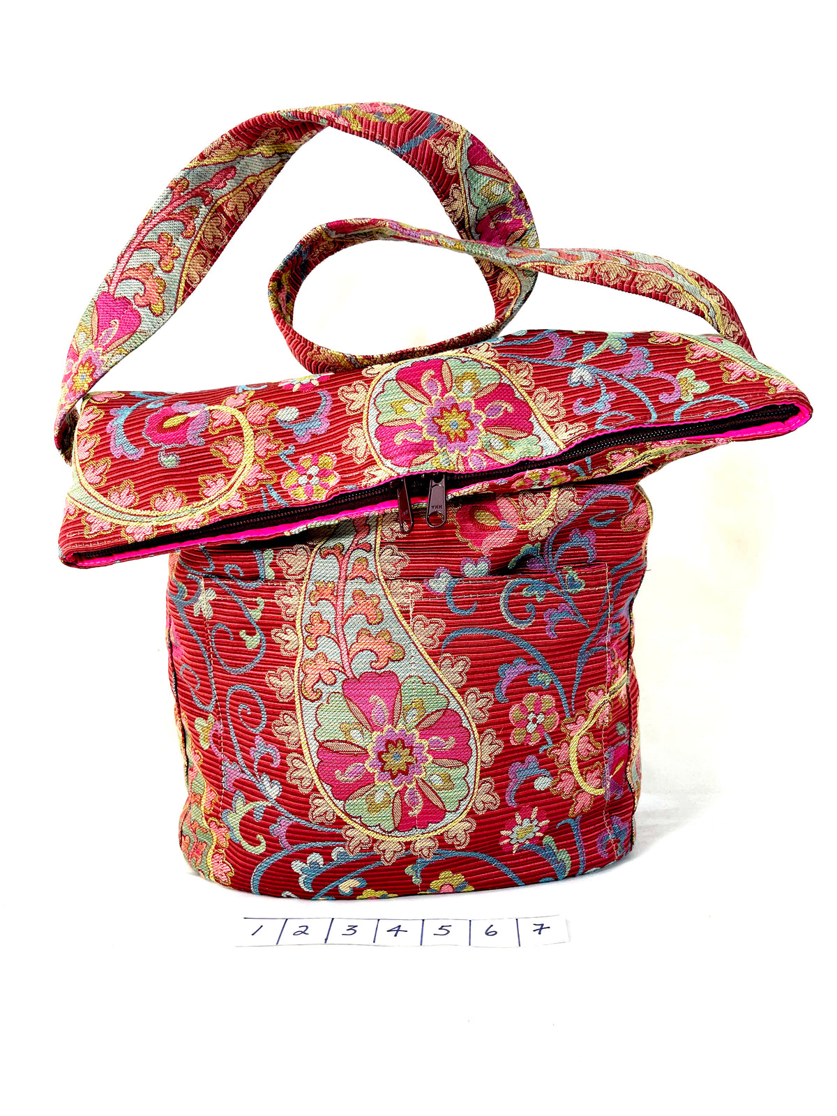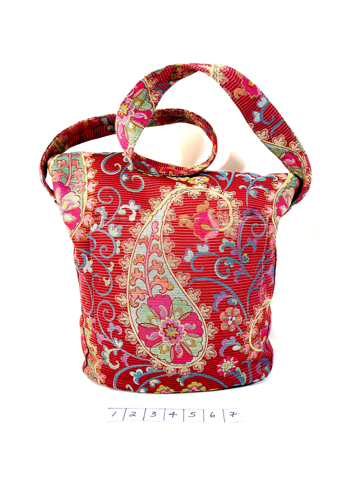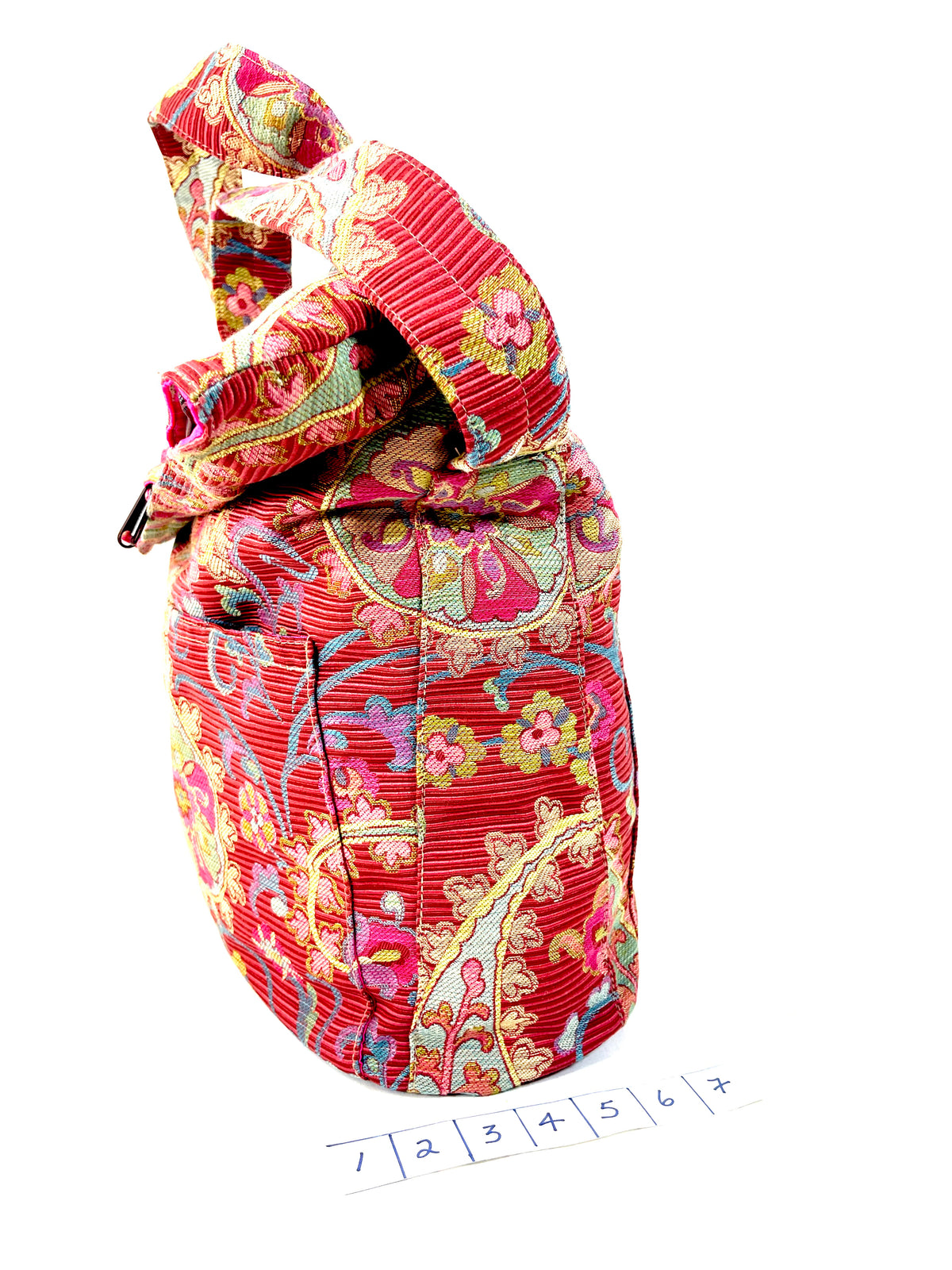 Pink Paisley Sack Purse. The background of this jacquard fabric is woven with subtle thin bands background in darker and lighter pink, topped with floral motifs in pinks, golds, blues and lavender. The big paisley shapes have a large floral design in the bottom part of the teardrop shape, and a leafed stem that extends into the narrowing part of the curved paisley. The background of the paisley shape is a soft aqua color. The outer pocket flap is adorned with a stunning iridescent swirling flower. Lined in Pink.
